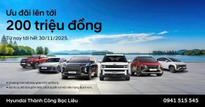 Bạc Liêu – Tháng 11/2025, Liên doanh ô tô Hyundai Thành Công Bạc Liêu chính thức triển khai chương trình ưu đãi kép hấp dẫn “Bảo hành 8 năm – An tâm vận hành” cùng nhiều hỗ trợ chi phí sở hữu khác cho các mẫu xe Palisade, Santa Fe, Tucson, Creta, Accent, Stargazer và Grand i10.