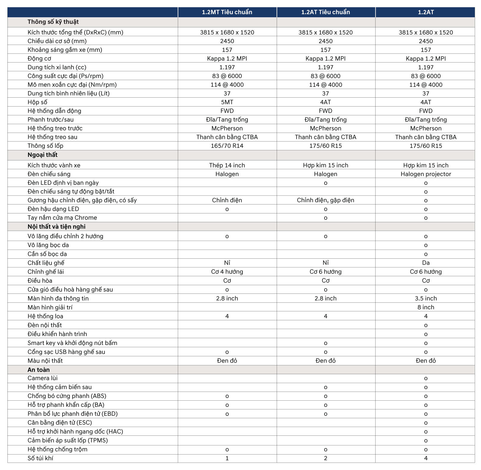 Động cơ 4 xylanh Kappa dung tích 1.2L, đi cùng công nghệ van biến thiên Dual VTVT, cho công suất cực đại 87 mã lực tại 6.000 vòng/phút và moment xoắn 120 Nm tại 4.000 vòng/phút.