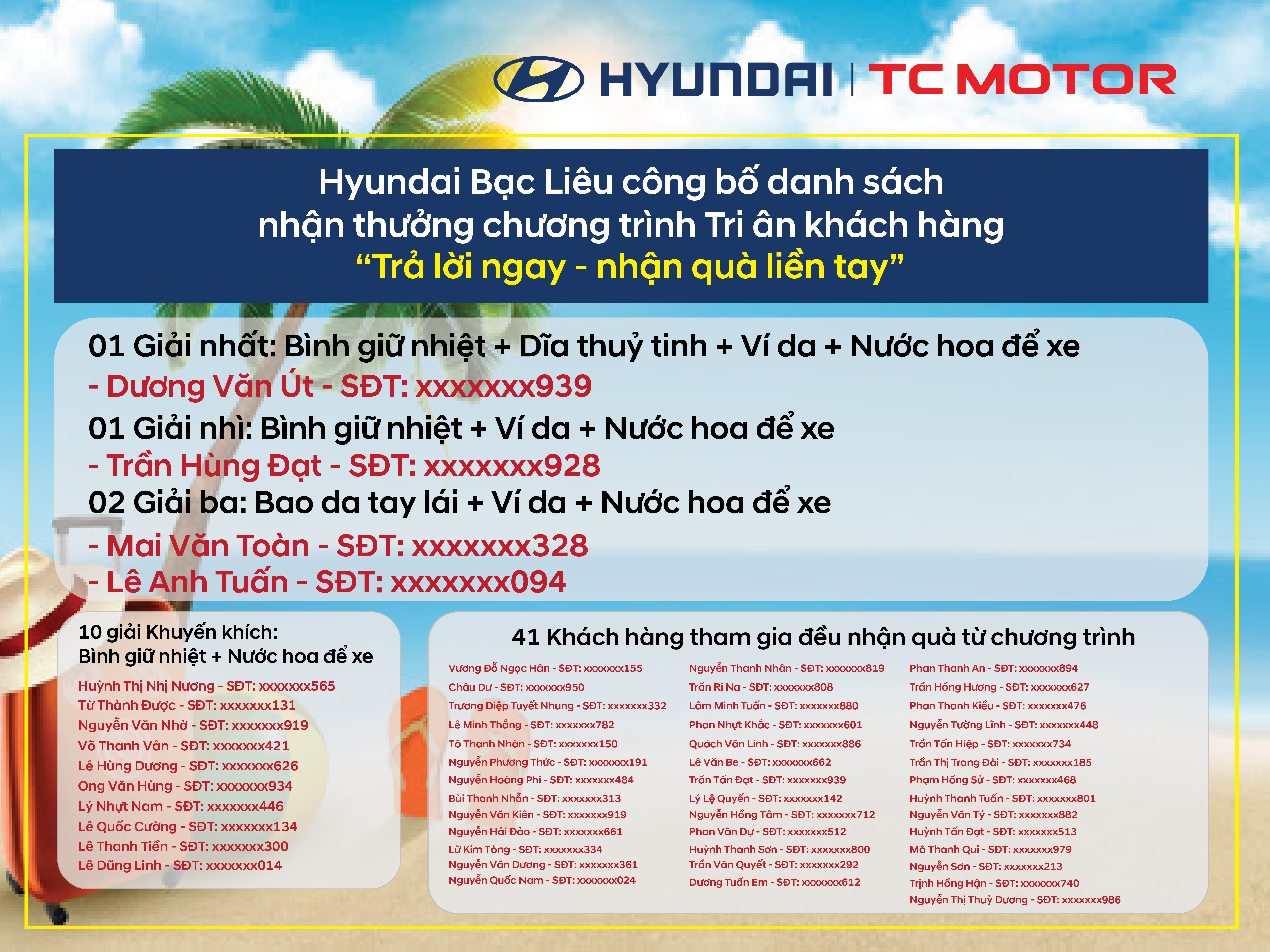 Và 10 giải khuyến khích. Tất cả khách hàng tham gia chương trình được nhận 01 phần quà tri ân từ Hyundai Bạc Liêu.